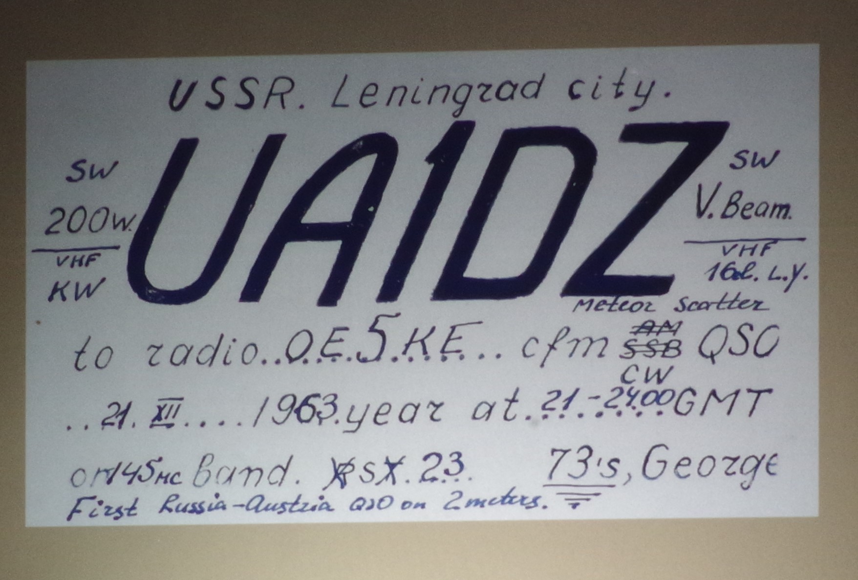 Einen ganz tollen Vortrag mit dem Titel „UKW vor 60 Jahren“ über die Entwicklung des UKW-Amateurfunks hat uns Adolf (Adi), OE5KE, beschert! Er ist seit 1961 lizensiert und als Elektronikingenieur von Anfang an dabei gewesen! Alle sind den, mehr als eine Stunde dauernden, interessanten Ausführungen gefolgt und waren begeistert und beeindruckt wie 2-Meter-Funk vor mehr als einem halben Jahrhundert funktioniert hat! Echt spannend, die Entwicklung der Sende-und Empfangstechnik über 30 MHz hinaus ins VHF-Band mit der Technologie, die damals zur Verfügung stand! Eine Erstverbindung via Meteorscatter zwischen Russland und Österreich möchte ich als Beispiel zeigen, die QSL-Karte dazu ist auf einem Bild zu sehen! Adi, danke für dieses einmalige Erlebnis!