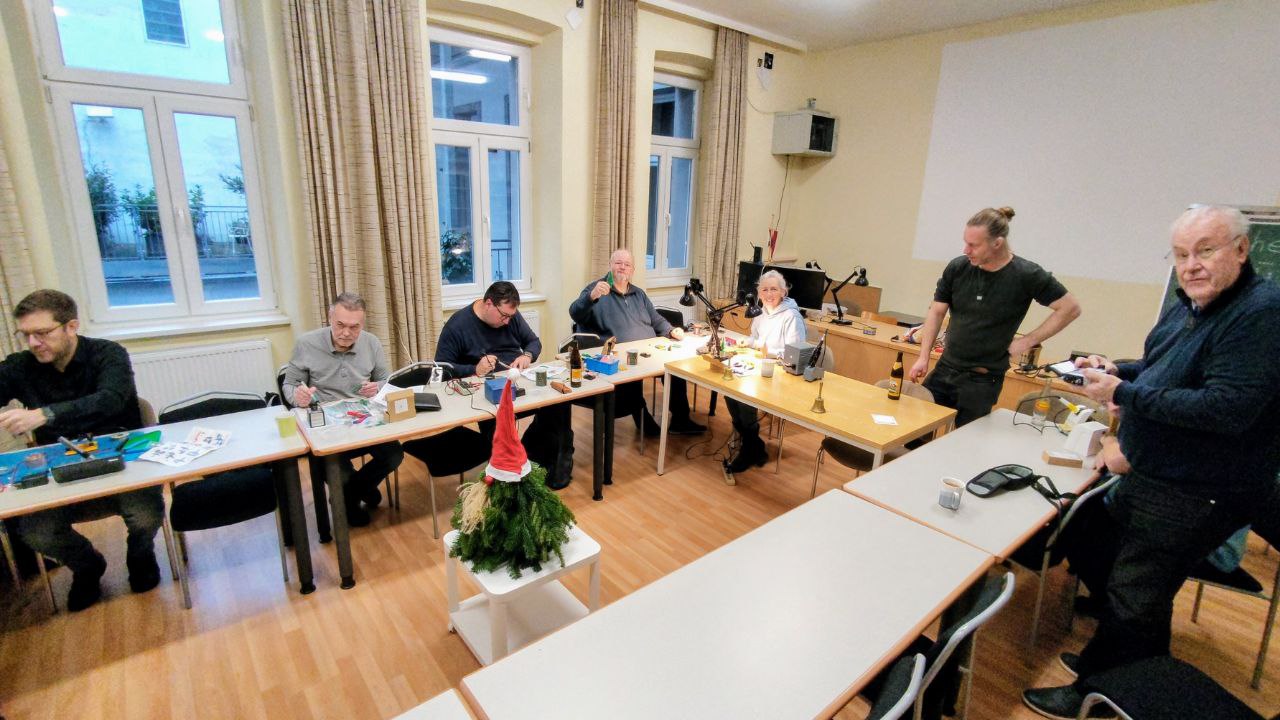 Lötübung für Einsteiger wurde gut angenommen. Beim Treffen im Clubheim, nach dem Flohmarktbesuch vom Vormittag, kam eine Gruppe von YL und OMs im Clubheim zusammen. Die von Arnold organisierten Bäume wurden gemeinsam aufgebaut. Stefan OE1UHU war einer der Bäumebaer. Durch seine Berufserfahrung zählte er zu den besonders geeigneten Unterstützern der Löteinsteiger.