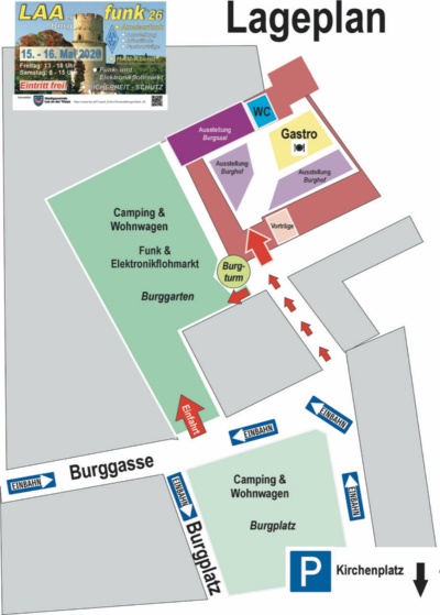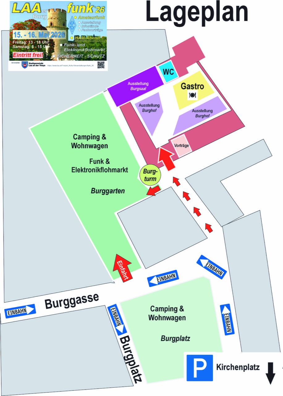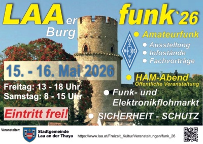 Die Laaer Burg, eine Location, die im Vergleich zur Tennishalle wesentlich zentraler im Kern der Stadt Laa gelegen; ist wenige Minuten zu Gastronomie, Hauptplatz, Therme und Einkaufsmöglichkeiten, trotzdem aber mit ausreichend Platz um zu parken, zu campieren und Flohmarktbetrieb zu machen. Der Burgsaal ist modern eingerichtet und wird sowohl Örtlichkeit für Vorträge als auch für die Aussteller genutzt werden. Burghof und Burggarten bieten ein Freiluftareal mit Infrastruktur. Als große Attraktion steht auch der Turm zur Verfügung und wartet förmlich darauf, mit Antennen bestückt beziehungsweise bengt zu werden.